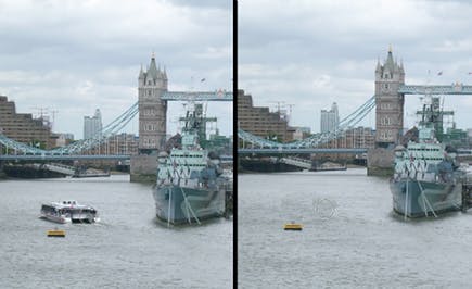 Het kloonstempel is gemaakt om objecten te vervangen door een achtergrond. Wij vervangen het bootje door water. Klik daartoe eerst in de gereedschapsbalk op het kloonstempel. Daarna is het belangrijk dat u een behoorlijke penseelbreedte selecteert in de optiebalk. In dit voorbeeld gebruikten we een breedte van 100 pixels. Vervolgens houdt u de Ctrl-toets ingedrukt en u klikt ergens op een brongebied. Hier is dat het water. U laat de Ctrl-toets los en klikt daarna op het object dat u wilt verwijderen. Het object wordt nu vervangen.