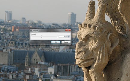 Voordat u scherpte gaat toevoegen, moet u eerst de scherpte op de juiste manier beoordelen, hiervoor moet u inzoomen tot 100%. 100% betekent dat één beeldpuntje van uw digitale foto precies overeenkomt met één beeldpuntje van het scherm. In de knoppenbalk zet u het zoompercentage dus op 100%. Daarna gebruikt u Effects / Photo / Sharpen. Dit filter werkt erg rechttoe rechtaan. Verschuif de regelaar Amount tot u helemaal tevreden bent en wacht eventjes tot het beeld opnieuw is berekend. Klik ten slotte op OK.