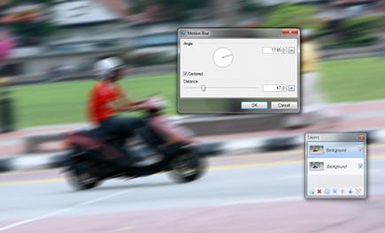 Paint.NET heeft verschillende vervagingsfilters die u op een creatieve manier kunt toepassen. Om bewegende objecten nog meer snelheid te geven, doet u beroep op het effect Motion Blur. Dupliceer eerst de laag van de afbeelding via Layers / Duplicate Layer. U vindt de snelheidsvervaging bij Effects / Blurs / Motion Blur. Geeft hier eerst de richting van de beweging aan met het wieltje. In het vak Distance bepaalt u de lengte van de vervaging. Hoe groter de lengte, hoe sneller het object zich lijkt voort te bewegen.