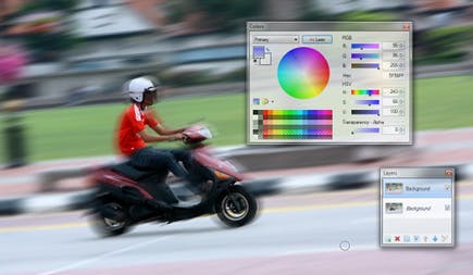 De afbeelding bestaat nu dus uit twee lagen. Klik in het palet Layers op de bovenste laag om deze te selecteren. We gaan nu de motorrijder uit deze laag gummen zodat deze opnieuw scherp wordt. Het probleem is dat Paint.NET geen zacht gummetje heeft, waardoor de gumrand heel lelijk wordt. Open daarom het palet Colors, klik op More. Wijzig de alfa-waarde onderaan bij Transparency - Alpha. Zet de waarde op 8. Op die manier creëert u via een omweg toch een zachte gum.