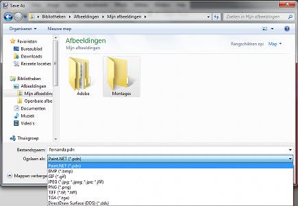 Wanneer een document dat uit verschillende lagen bestaat, helemaal klaar is, kunt u de lagen samenvoegen met Layers / Merge Layer Down. Er is geen opdracht om een drie of meer lagen tegelijk samen te voegen, in dat geval moet u de opdracht dus meerdere keren na elkaar gebruiken. Paint.NET bewaart zijn bewerkte documenten standaard in het pdn-formaat, dat lagen ondersteunt. Wilt u de afbeelding invoegen in een ander programma zoals MS Word of PowerPoint, dan moet u het plaatje wel eerst met File / Save as wegschrijven in jpg-, png-, tiff-, of bmp-formaat.