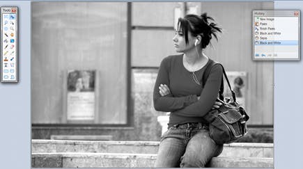 Paint.NET heeft een functie om de afbeelding snel om te zetten naar zwart-wit. Dat is de opdracht Adjustments / Black and White. De foto blijft wel in RGB-modus, wat wil zeggen dat u nog steeds kleuren kunt manipuleren en toevoegen. Als u gaat kijken naar Adjustments / Hue/Saturation dan ziet u dat het programma de verzadiging van rood, groen en blauw volledig heeft onderdrukt. U kunt de zwart-witafbeelding rechtstreeks omzetten naar sepia met Adjustments / Sepia.