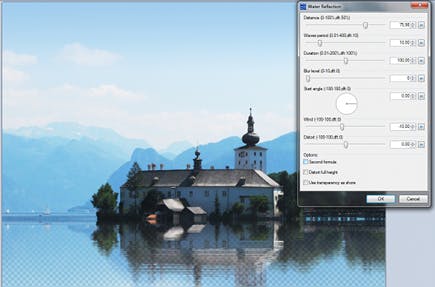 Ook het filter om waterreflectie te creëren is gratis. U haalt het op Paint.Net. Daar opent u de map Distort en onderaan vindt u het filter Water Reflection. In Paint.NET vindt u het geïnstalleerde filter bij Effects / Distort / Water Reflection. Lijken de instellingen ingewikkeld? Werk gewoon van boven naar onder. Eerst bepaalt u de hoogte van de horizontlijn, daarna de vervaging, de wind en de vervorming. Dit is een uitstekende vondst voor plaatjes aan het meer of aan een rivier, waar aanvankelijk geen weerkaatsing te zien was.