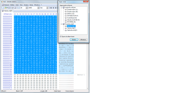 De MBR bevindt zich onveranderlijk op de eerste fysieke sector van uw harde schijf en heeft net als de andere sectoren een standaardgrootte van 512 bytes. Deze sector ligt echter buiten de eigenlijke partities en is dus niet zomaar met standaard I/O-functies van Windows bereikbaar. U kunt deze MBR echter wel benaderen met behulp van een zogenoemde fysieke schijf-editor. Een gratis tool voor Windows is HxD, die dubbelt als hex-editor, oftewel een tool waarmee u bestanden in binaire (hexadecimale) vorm kunt bekijken. De MBR krijgt u als volgt in beeld. Start HxD als administrator op, open het menu Extras en klik bij Fysische schijf op Harde schijf 1. Veiligheidshalve toont HxD u de sector in leesmodus, totdat u het vinkje verwijdert bij Open als alleen lezen, u doet dat echter geheel op eigen risico. De op twee na laatste 64 bytes van de MBR vormen samen de (4 x 16 bytes van) de hoofdpartitietabel.