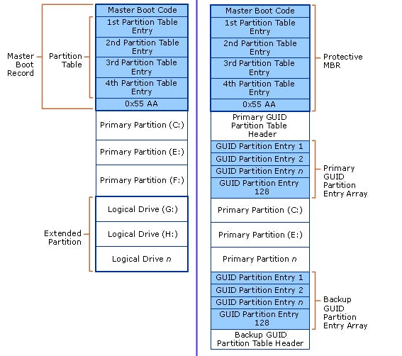 Links het MBR-schema, rechts GPT. Merk bij deze laatste de 'Protective MBR'-sector op: een dummy MBR voor oudere software. (bron: MSDN, Microsoft)