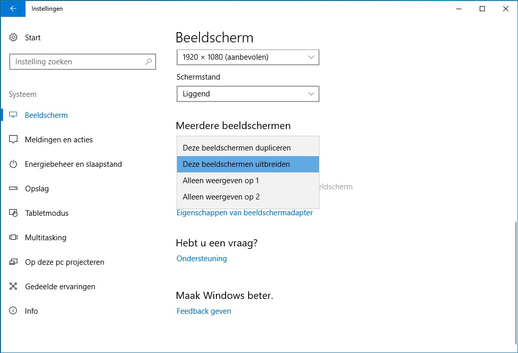 Zelfs de kleinste laptops hebben aan de zijkant meestal een extra video-uitgang. Meestal is dat (micro-)hdmi, maar dat kan net zo goed (mini-)displayport, vga of usb-c zijn (zie hiervoor tip 7). Je gebruikt deze aansluitingen om een extra monitor op je laptop aan te sluiten. In feite breid je het bureaublad daarmee uit, zodat je meer ruimte hebt. Dit werkt een stuk prettiger, omdat je dialoogvensters niet meer hoeft te minimaliseren naar de taakbalk. Na aansluiting van een externe monitor herkent het besturingssysteem van je laptop het scherm meestal automatisch. Ga zo nodig naar Start / Instellingen / Systeem / Beeldscherm en kies bij Meerdere beeldschermen voor de optie Deze beeldschermen uitbreiden. Zo beschik je over een reusachtig bureaublad. Je kunt er ook voor kiezen om de beeldschermen te dupliceren. Dat is bijvoorbeeld handig wanneer er in plaats van een monitor een beamer op de laptop is aangesloten. De beamer geeft zo exact dezelfde beelden weer als het scherm van je laptop. Handig wanneer je een presentatie geeft of een diavoorstelling wilt laten zien!