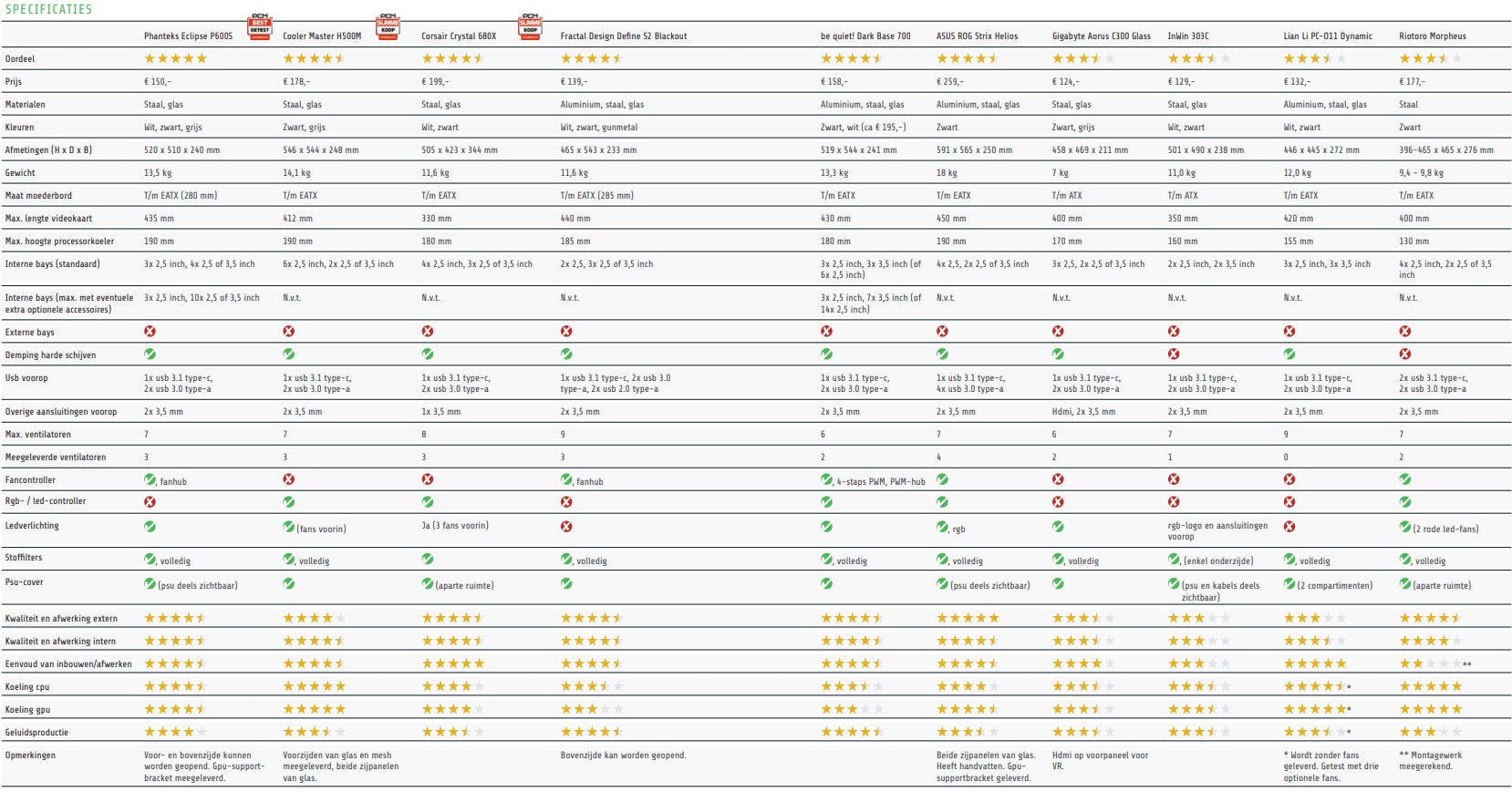 Desondanks willen we een paar objectief positieve uitschieters belonen. Zo vallen de be quiet! Dark Base 700, Fractal Design Define S2, en Phanteks Eclipse P600S op door hun hoge kwaliteit, vele mogelijkheden en toch bescheiden prijsstelling. Phanteks pakt echter de winst met all-round-topprestaties met hier en daar een extra puntje op de i, met als resultaat onze waardering Best Getest.