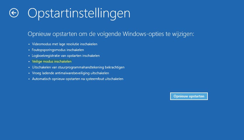 Verwijder nu het boot-medium en klik daarna op Doorgaan. Zodra de pc begint te herstarten druk je herhaaldelijk op F8 tot je het menu Geavanceerde opstartopties ziet verschijnen. Hier kies je dan Veilige modus en bevestig je met Enter. Om die speciale opstartmodus weer uit te schakelen voer je via Opdrachtprompt (administrator) het volgende commando op de opdrachtregel uit: bcdedit /set {default} bootmenupolicy standard.