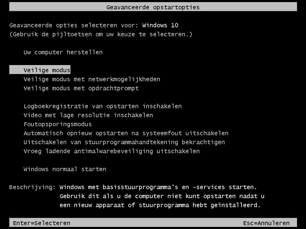 De ‘veilige modus’ zit goed verstopt in Windows 10 en zeker wanneer het besturingssysteem niet meer op de gewone manier wil opstarten. In dat geval start je de pc op met de installatieschijf van Windows en kies je Volgende / Uw computer herstellen. Daarna klik je achtereenvolgens aan: Problemen oplossen / Geavanceerde opties / Opdrachtprompt. Op de opdrachtregel voer je de volgende commando’s uit: c:> bcdedit /set {default} bootmenupolicy legacy exit