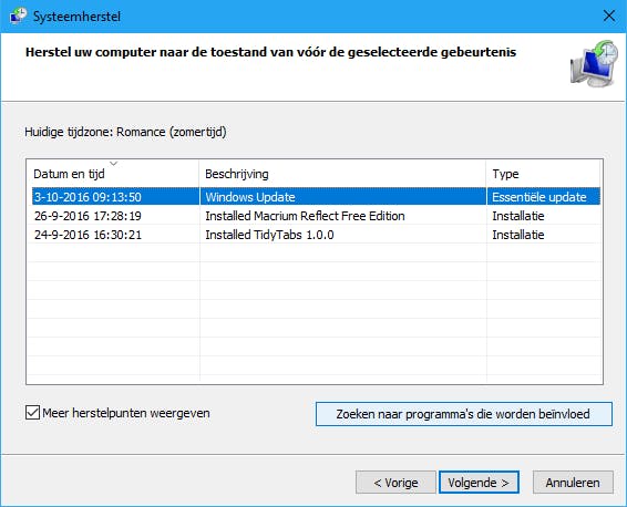 Eventueel kun je ook een systeemherstel overwegen, dat je al dan niet vanuit de veilige modus opstart. Dat kan onder meer door Windows-toets+R in te drukken en het commando rstrui.exe uit te voeren, waarna je het gewenste systeemherstelpunt selecteert. Wellicht is dat een herstelpunt dat werd gecreëerd kort voor de eerste verschijning van het BSOD. Ook vanuit de Windows-herstelomgeving is het mogelijk het systeemherstel aan te roepen.