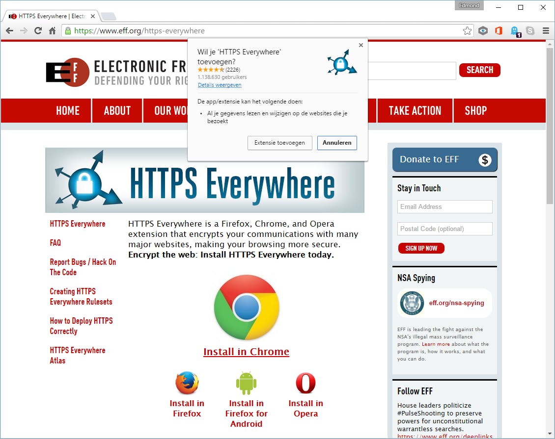 Bij https wordt er eerst een versleutelde verbinding opgezet en gaat daarna al het verkeer tussen de browser en de webserver via die veilige verbinding. Je kunt natuurlijk zelf altijd controleren of een website ook https aanbiedt, maar gemakkelijker gaat het met de HTTPS Everywhere plug-in voor Chrome, Opera en Firefox. HTTPS Everywhere weet van heel veel websites of ze ook https ondersteunen en wanneer het een site nog niet kent, zal het dat zelf controleren. Een heel handig programma dus, en ook nog gratis ter beschikking gesteld door de Electronic Frontier Foundation, een groep die vecht voor meer privacy op het internet. Ga hiernaartoe en klik op Install. Na de installatie vind je een HTTPS Everywhere-knop naast de adresbalk. Echt nodig heb je de bijbehorende opties niet: de plug-in werkt direct en bijna volledig automatisch.