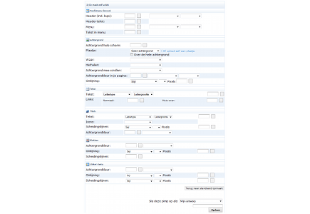 Als u op het uitschuifmenu klikt achter de kleur, kunt u ook nog de transparantie aanpassen in stappen van tien procent. Hoe meer doorzichtig, hoe lichter de gekozen kleur wordt. Daar weer achter kunt u kiezen of de kleur een verloop moet krijgen (zwarte gloed) of dat de kleur solide moet zijn (geen gloed). Naast de Header, kunt u ook de menubalk op dezelfde wijze aanpassen naar uw eigen smaak. Logischerwijs is het wel aan te raden om voor Menu en Tekst in menu afwijkende en contrasterende kleuren te kiezen, anders loopt u het risico dat de menu-items niet leesbaar zijn.