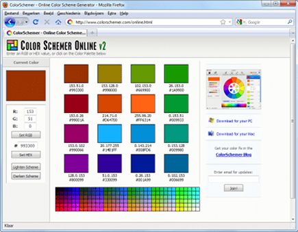 Met behulp van de 'online color schemer' kunt u snel bijeenpassende kleuren kiezen.