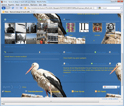 Het standaard design van Hyves is sober met veel witruimte. Hierdoor is alles goed leesbaar, maar heeft het een bijna zakelijke uitstraling. Als dit niet bij u past, dan kunt u het design heel eenvoudig naar uw eigen hand zetten. U kunt een eigen achtergrondfoto en kleuren kiezen, waardoor uw online profiel meer overeenkomt met hoe u zelf bent. Log in op hyves (we gaan er vanuit dat u een Hyves-account hebt) en ga linksboven in het menu naar Mijn Profiel/Pimp my profile!.