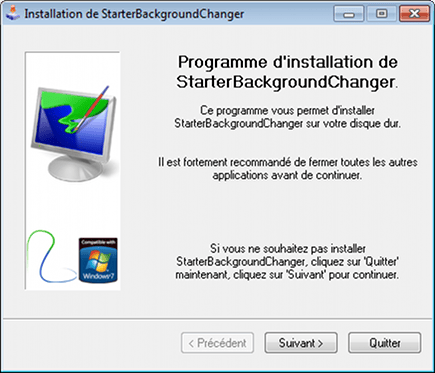 Op de meeste nieuwe netbooks staat Windows 7 Starter geïnstalleerd. Op zich een prima besturingssysteem voor wie zonder de grafische pracht van Aero kan. Echter kunt u ook geen eigen bureaubladachtergrond meer kiezen. Gelukkig is het via een omweg toch mogelijk om deze te wijzigen. U hebt hiervoor een extra programma nodig, StarterBackgroundChanger, dat de benodigde functionaliteit weer terugbrengt in Windows 7 Starter. Surf naar de website van StarterBackgroundChanger en klik op Download. Vervolgens klikt u op de pagina die nu opent nogmaals op Download. Sla het uitvoerbestand op en voer het uit nadat het downloaden voltooid is. Omdat StarterBackgroundChanger een Franstalig programma is, is de installatie in het Frans. Klik driemaal op Suivant om de wizard te doorlopen en vervolgens op Démarrer om het programma daadwerkelijk te installeren. Het installatieprogramma zal u melden dat de installatie succesvol voltooid is. U klikt op Suivant en vervolgens op Quitter om het installatieprogramma af te sluiten.