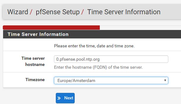 Op je client-systeem ga je vervolgens met een browser naar het adres https://192.168.1.1. Het aanmeldvenster verschijnt waar je (aanvankelijk) admin als inlognaam en pfsense als wachtwoord invult. Het pfSense-dashboard verschijnt en via de Next-knop start je een configuratiewizard op (je bereikt die ook via System / Setup wizard). Druk een paar keer op Next tot je het scherm ziet waar je een geschikte hostname en domain kunt invullen, samen wordt dat de FQDN (de ‘Fully Qualified Domain Name’) van je pfSense-firewall.