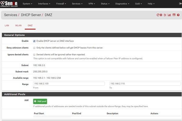 Heb je net als wij meerdere netwerkinterfaces ingeschakeld op je pfSense-machine (in ons geval dus WLAN en DMZ), dan loop je meteen tegen enkele problemen aan. Wanneer je een toestel op één van die interfaces aansluit, krijgen die geen IP-adres toebedeeld (en wordt er dus ook geen data naar doorgestuurd.