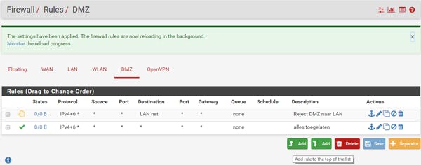 Onze tweede regel komt er net als de eerste uit te zien, met twee belangrijke verschillen: Action stel je in op Reject en Destination (alleen) op LAN net. Je DMZ-interface werkt nu zo dat alleen verkeer naar je LAN verbonden blijft. Je kunt nu in principe veilig één of andere (publiek toegankelijke) server aan je DMZ-interface hangen.