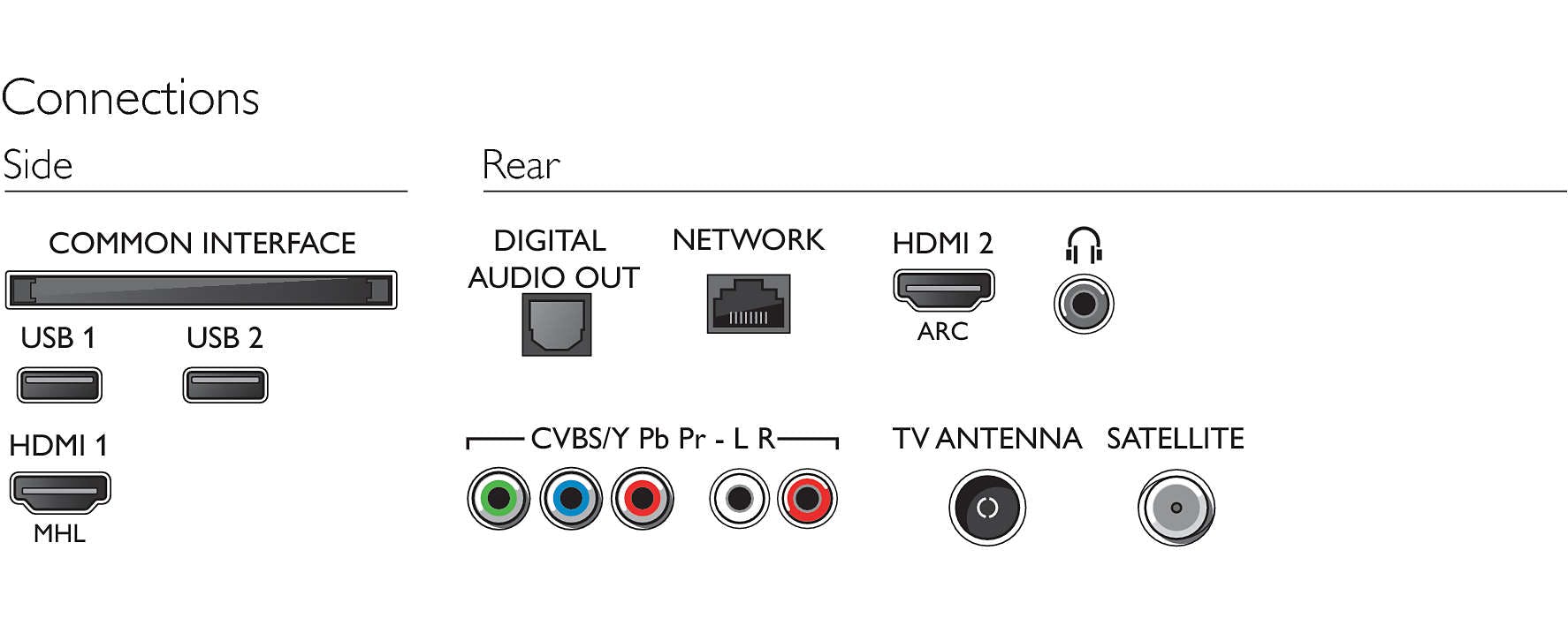 - Connectiviteit: 2 x HDMI, 2 x USB, CI+, optische audio-uitgang, IEC75-antenne, Ethernet-LAN, satellietaansluiting, hoofdtelefoonaansluiting, WiFi