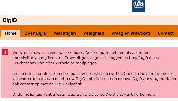 Ook op Digid.nl wordt gewaarschuwd voor dezelfde phishingcampagne: