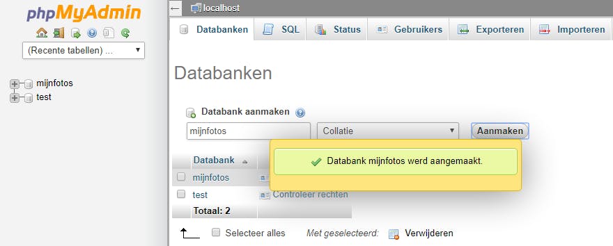Over naar het tabblad Databanken, waar je bij Databank aanmaken een geschikte naam voor je fotodatabank invult. Laat de optie Collatie ongemoeid. Bevestig met Aanmaken. De nieuwe database verschijnt in het linkerpaneel en je kunt PhpMyAdmin verlaten.