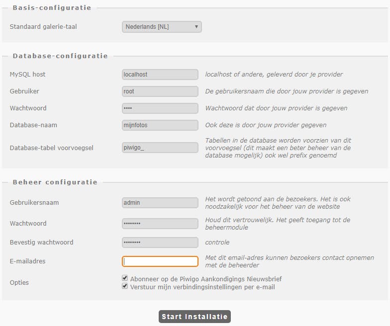 Tot slot kies je zelf een gebruikersnaam, die zal zichtbaar zijn voor bezoekers. Stel ook geen goed wachtwoord in. Vul tevens je e-mailadres in (en verwijder beide vinkjes). Rond af met Start installatie. Piwigo is zo vriendelijk je een rondleiding aan te bieden en waarom zou je niet?