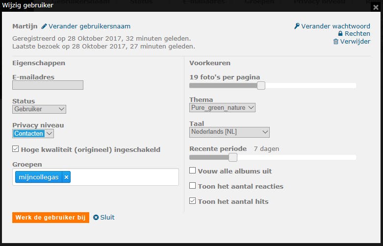 Nu moet je nog aangeven dat je een bepaald fotoalbum alleen zichtbaar wilt maken voor je collega’s. Open de rubriek Albums / Beheer, selecteer het gewenste (sub)album en kies Wijzig. Open het tabblad Rechten van dit album, kies Privé en selecteer de juiste groep(en) bij Rechten verleend aan groepen.