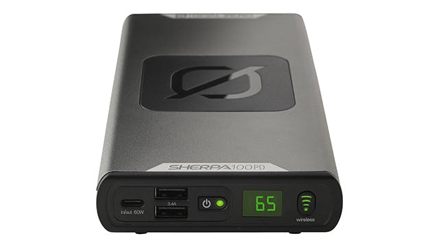 Naast interessante generatoren voor particulieren ontwikkelt Goal Zero ook powerbanks met minder accucapaciteit. Toch levert de Sherpa 100PD nog altijd een respectabele elektrische lading van 25.600 mAh. Naar verhouding is het product wat aan de dure kant, maar deze powerbank heeft dan ook een interessante eigenschap. De behuizing bevat namelijk aan de bovenzijde een elektromagnetisch inductieveld, zodat je een geschikte smartphone via de Qi-standaard draadloos kunt opladen. Dat kan bijvoorbeeld met een recente iPhone of een Samsung Galaxy S-toestel. Zodra de draadloze verbinding actief is, merk je dat aan een groene indicator op het voorpaneel.