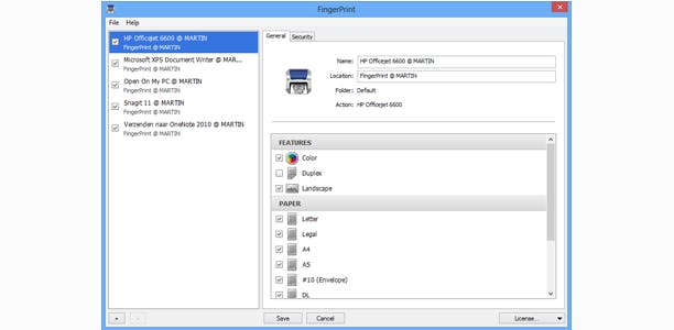 Zodra je FingerPrint 2 hebt geïnstalleerd en gestart, zie je aan de linkerkant direct een lijst met beschikbare printers. Wellicht staan hier meer printers terwijl je er toch echt maar eentje in huis hebt, maar dat komt omdat digitale printers (zoals software die Word-documenten omzet in pdf-bestanden) ook als printers worden gezien.