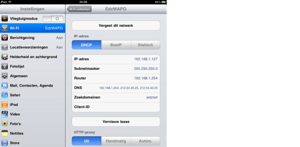De iPad is een netwerkapparaat. De netwerkinstellingen van de iPad zijn te vinden via Instellingen / Wi-Fi. Hier ziet u de draadloze netwerken die beschikbaar zijn, het netwerk met het vinkje ervoor wordt ook daadwerkelijk gebruikt. Om meer informatie over dat netwerk te zien en de netwerkconfiguratie, zoals het IP-adres, op te vragen, klikt u op de blauwe pijl achter de naam van het netwerk. Standaard gebruikt een iPad DHCP, wat betekent dat het elke keer bij het opstarten een IP-adres krijgt toegewezen. Een vast adres toewijzen is ook mogelijk door van DHCP over te schakelen op Statisch, maar in de praktijk is daar eigenlijk nauwelijks reden toe.