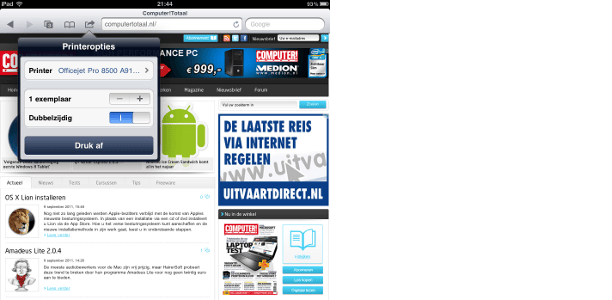 Ondersteunt een printer AirPrint, dan zal de iPad die printer automatisch vinden. De printer biedt zijn AirPrint-dienst namelijk aan op het netwerk, en de iPad herkent het aanbod en weet hoe het er gebruik van kan maken. Belangrijk is wel dat iPad en printer in hetzelfde netwerk zitten. Dit betekent niet dat de printer ook draadloos moet zijn, wel dat de iPad en AirPrint-printer in dezelfde IP-reeks een IP-adres moeten hebben en er geen routers of firewalls tussen de twee mogen zitten. Vergelijk zo nodig de netwerkconfiguratie van de printer en de iPad via de tips uit tip 01. Is aan de voorwaarden voldaan, dan klikt u op de Actie-knop in het iPad-programma. Kies dan Druk af, selecteer het gewenste aantal exemplaren door op plus of min te drukken en kies voor Dubbelzijdig of niet. Klik dan op Druk af. De Actie-knop die toegang geeft tot onder meer de printfunctie ziet eruit als een kromgebogen pijl die rechts omhoog wijst, in Safari zit deze bijvoorbeeld links naast de adresbalk. Mogelijkheden om het papierformaat en de oriëntatie (liggend of staand) te kiezen ontbreken. Dat is blijkbaar de prijs die betaald moet worden voor het driverloze gemak dat Apple met AirPrint wil bieden.