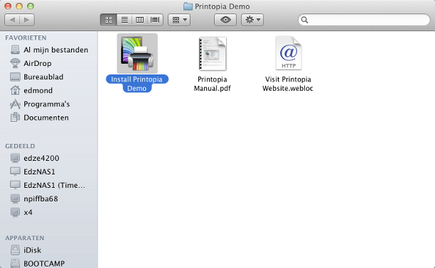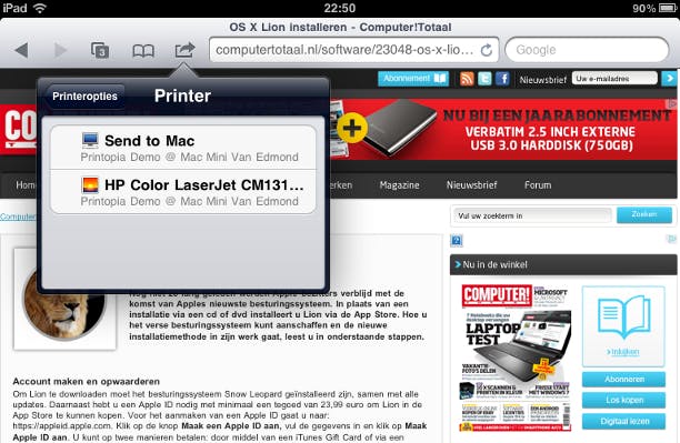 De kans dat uw printer AirPrint ondersteunt is veel kleiner dan de kans dat AirPrint niet wordt ondersteund. Gelukkig is het dan nog steeds niet onmogelijk om met een iPad te printen. Een eerste alternatieve methode is door de printer te verbinden met een Apple-computer (iMac, Mac Mini of MacBook) en te delen. Het werkt het beste als de printer direct aangesloten is of bereikbaar is via een AirPort of TimeCapsule. Anders werkt ook een gewone netwerkprinter. Daarnaast is nog het printerprogramma Printopia nodig. Het programma kost 20 dollar (ca. 14,50 euro), maar u kunt eerst zeven dagen de proefversie gebruiken. Download de demoversie en kies voor Install Printopia Demo. Printopia deelt automatisch alle printers via AirPrint die op het netwerk van de de Apple-computer beschikbaar zijn. Na de installatie van Printopia ziet u dat op de iPad via de Actie-knop / Druk af / Kies printer de printer te vinden is, waarmee u op de Apple-computer kunt afdrukken. De extra optie Kies printer is nodig omdat Printopia ook nog extra opties toevoegt. U kunt een afdruk bewaren als bestand op de computer of rechtstreeks opslaan op uw Dropbox. Omdat de Apple-computer als een soort printserver dient, moet hij wel altijd aanstaan om via de iPad erop te kunnen afdrukken.
