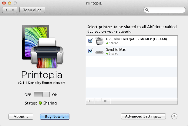 Printopia deelt de printers op de Mac-computer via AirPrint op het netwerk.