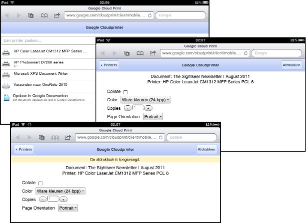 AirPrint werkt, zoals gezegd, alleen wanneer de iPad en de printer in hetzelfde netwerk zitten. Dit geldt niet voor Google Cloud Print. De printdienst van Google werkt via internet, en zowel een printer die via Windows is verbonden als een printer die op een NAS is aangesloten kan gebruikt worden om vanaf elk apparaat en vanaf elke plek ter wereld op die printer af te drukken. Installeer eerst Google Chrome. Start dan Chrome en klik rechtsboven op het gereedschapteken, kies Opties. Selecteer Geavanceerde opties en daarna onder aan de pagina Aanmelden bij Google Cloud Print. Log nu in met uw Google-account. Wanneer u dat nog niet hebt, kunt u die hier aanmaken. Klik op Aanmelden. Ingelogd komt u terug bij de opties, kies Instellingen voor afdrukken beheren / Printers. Hier ziet u alle printers die op de pc bekend zijn. Deze zijn nu opgenomen in de Google Cloudprinter. Ga nu naar de iPad en open de App Store. Zoek op Google en selecteer en installeer de Google Mobile App. Start Google Mobile App en klik rechtsboven op het radertje om de configuratieopties te openen. Klik op Google Account en voer uw accountnaam en wachtwoord in. Bevestig via Aanmelden, sluit af via Instellingen / Gereed. Start nu op de iPad via Google Mobile App / Google Docs. Open een document en kies via het pijltje rechts Afdrukken. Er wordt een nieuwe webpagina geopend met de gegevens van de Google Cloud Print-service. Selecteer de printer waarop u wilt afdrukken, kies de afdrukopties en bevestig met Afdrukken. Even later rolt de afdruk uit de printer.