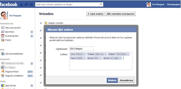 Om een overzicht te krijgen van je verschillende lijsten, klik je op de Facebook-startpagina in de linkerkolom op Meer naast Vrienden. Standaard zie je lijsten zoals Goede vrienden, Kennissen, Familie en Uw stad-omgeving. Met de knop + Lijst maken kan je eenvoudig nieuwe lijsten aanmaken. Kies een Lijstnaam en voeg vervolgens leden toe door de beginletters van de naam in te voeren. Selecteer de mensen die je aan de lijst wilt toevoegen en bevestig met Maken.