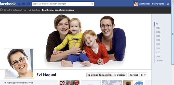 Zou je graag willen weten hoe anderen jouw profielpagina zien? Kies de knop met het slotje bovenaan in de blauwe balk om de Privacysnelkoppelingen op te roepen en kies Weergeven als bij Wat zien anderen op mijn tijdlijn. Je krijgt nu je profielpagina te zien, maar helemaal bovenaan wordt een donkergrijze balk zichtbaar. In eerste instantie krijg je te zien hoe mensen waarmee je niet bevriend bent, je profiel kunnen bekijken. Wanneer je klikt op Bekijken als specifieke persoon, kan je de naam van een vriend invoeren. Met de knop met het kruisje uiterst links in de balk sluit je deze weergave af.
