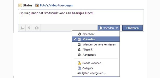 Als je op je prikbord een nieuwe status invoert, krijg je naast Plaatsen te zien wie jouw bericht na het plaatsen kan bekijken, bijvoorbeeld Vrienden. Door op het blauwe driehoekje te klikken, kan je snel een andere vriendengroep selecteren. Openbaar kan iedereen zien, ook Facebook-gebruikers die geen vrienden zijn.