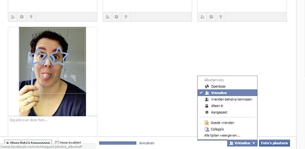 Net als bij berichten, kan je bij foto’s ook zelf instellen wie ze mag bekijken. Wanneer je een nieuw album aanmaakt, kan je helemaal onderaan instellen wie de foto’s mag zien. Open het uitklapmenu naast Foto’s plaatsen (het menu Albumprivacy) en kies een standaardgroep of vriendenlijst die je zelf aangemaakt hebt. Om de privacy-instellingen van een bestaand album te wijzigen, klik je op het album en kies je Bewerken. Bovenaan in de rechterhoek kan je aangeven wie toegang mag krijgen tot het album. Let wel, het standaardalbum waarin je omslagfoto’s bewaard worden, is altijd openbaar. Dit kan je in geen enkel geval wijzigen. Indien je niet wilt dat familiekiekjes door Jan en alleman bekeken kunnen worden, dan raden we je aan om deze niet als omslagfoto in te stellen.