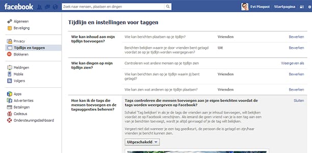 Om te voorkomen dat je getagd wordt in bikini of beschonken toestand, kan je een controlefunctie inschakelen. Klik op het tandwieltje rechtsboven in de blauwe balk en kies Privacyinstellingen. Kies vervolgens in de linkerkolom Tijdlijn en taggen. Schakel de functie Tags controleren die mensen toevoegen aan je eigen berichten voordat de tags worden weergegeven op Facebook in door op Bewerken te klikken en kies daarna Ingeschakeld.