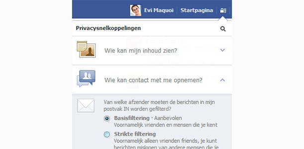 Via de privacysnelkoppelingen (op te roepen met de knop met het hangslot in de blauwe balk bovenaan) kan je zelf aangeven wie via Facebook contact met je kan opnemen. Klap het menu Wie kan contact met me opnemen? open en geef aan of enkel vrienden (Basisfiltering) of ook vrienden van vrienden (Strikte filtering) jou privéberichten mogen sturen.