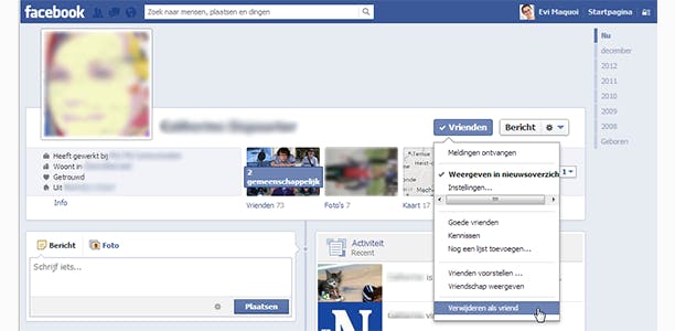 Word je lastiggevallen? Je kan iemand eenvoudig ‘ontvrienden’. Ga naar de profielpagina van de persoon in kwestie en houd je muiscursor boven Vrienden zodat het menu openklapt. Kies Verwijderen als vriend. De vriend in kwestie kan uiteraard wel nog een nieuw vriendschapsverzoek sturen. Wil je helemaal niets meer met deze persoon te maken hebben, dan kan je hem of haar blokkeren. Open de Privacysnelkoppelingen en klap het menu Hoe zorg ik dat iemand me niet meer lastig valt? open. Voer de naam of het e-mailadres van het persoon in en klik op Blokkeren. Via Alle geblokkeerde gebruikers bekijken krijg je een overzicht van geblokkeerde mensen. Indien gewenst kan je de blokkering hier ook opheffen.