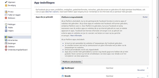 Om een overzicht te krijgen van de apps en games die je in het verleden al toestemming tot je profiel hebt gegeven, klik je op het tandwieltje rechtsboven in de blauwe balk en vervolgens op Accountinstellingen. Kies Apps in de linkerkolom. Helemaal bovenaan kan je het gebruik van apps volledig uitschakelen via Bewerken / Platform uitschakelen. Om specifieke apps te verwijderen, klik je op het kruisje naast de app en bevestig je je keuze met de Verwijderen-knop in het dialoogvenster. Via Bewerken kan je eventueel bekijken welke informatie de app-makers kunnen zien.