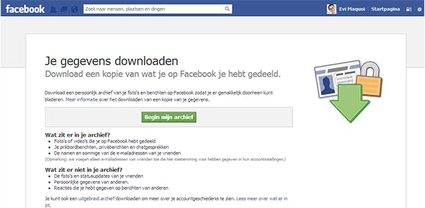 Steeds meer mensen stelden aan Facebook de vraag welke informatie er precies over hen beschikbaar was. De sociale netwerksite heeft een tijdje geleden groen licht gegeven om je eigen Facebook-gegevens te downloaden. Klik hiervoor op het wieltje rechtsboven en kies Accountinstellingen. Selecteer in de linkerkolom Algemeen. Onderaan kan je op Een kopie downloaden van je Facebook-gegevens klikken. In het archief dat Facebook van je heeft opgebouwd, zitten onder andere foto’s en video’s die je gedeeld hebt, prikbordberichten, privéberichten en chatgesprekken. Klik op de groene Begin mijn archief-knop om het downloaden te starten. Bevestig je keuze door nogmaals op Begin mijn archief te klikken. Het archiveren kan een tijd duren. Zodra jouw archief klaarstaat om te downloaden, ontvang je een e-mail met een link naar het archief.