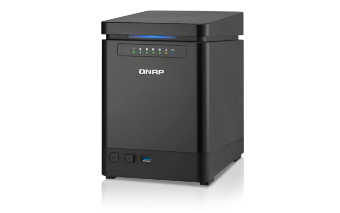 De NAS levert prima prestaties in de NASPT-test van gemiddeld 51 MB/s voor lezen en schrijven bij vier schijven in RAID5 en RAID10 en uitschieters voor lezen tot 94 MB/s. De NAS beschikt over een 2 Ghz quad-core Intel Celeron J1900-processor en 2 GB werkgeheugen. Het geheugen is via de onderzijde van NAS toegankelijk en kan met nog één DDR3L-geheugenmodule worden uitgebreid. Bij uitbreiden moet je wel twee geheugenmodules van dezelfde omvang plaatsen. Je kunt dus of een module van 2 GB plaatsen voor een totale omvang van 4 GB of de bestaande module vervangen door twee modules van 4 GB voor een totaal van 8 GB. Er is ook een variant van de NAS te koop met 8 GB werkgeheugen. De NAS beschikt verder over drie keer usb 3.0, twee keer usb 2.0, twee keer gigabit LAN en een HDMI-poort. Een van de usb3.0-poorten is aan de voorzijde geplaatst wat een jammere onderbreking is van het verder zo strakke design.
