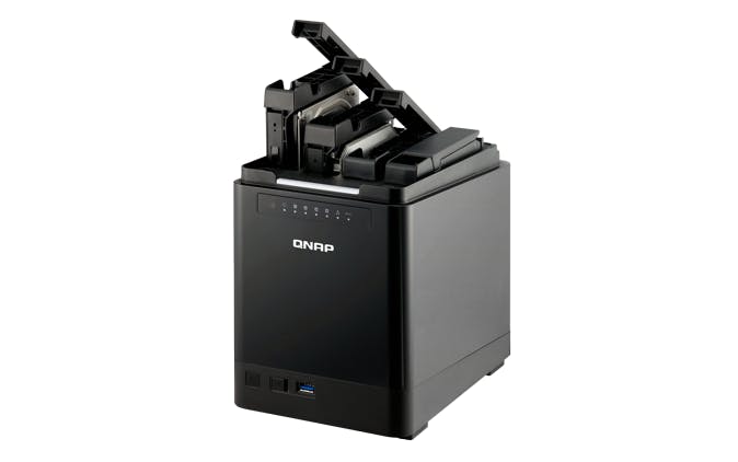 Aan de voorzijde van de behuizing zitten een grote brede led die met blauw en groen de status van de NAS aangeeft, plus nog kleine leds voor elke schijf, netwerk- en usb-activiteit. De leds kunnen worden gedimd of via een schema uitgeschakeld, maar wel allemaal tegelijk. Je kunt dus niet de grote led ingeschakeld laten terwijl je de andere vaak druk knipperende ledjes uitschakelt. Toegang tot de schijven krijg je door de deksel die bovenop zit, op te tillen. QNAP heeft het niet aangedurfd de zwaartekracht zijn werk te laten doen en de schijven los in de NAS te laten zakken, maar gebruikt vier plastic trays. Deze zijn volledig schroefloos, wat we nog niet eerder zagen bij QNAP. Het systeem hiervoor is een één op één kopie van wat concurrent Synology al enkele jaren gebruikt.