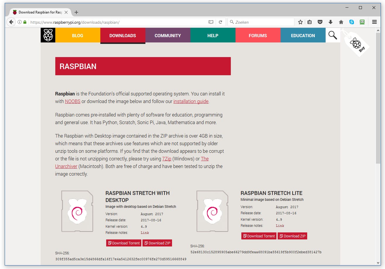 Wat resteert is het plaatsen van een geheugenkaart met het gewenste besturingssysteem in het micro-sd-slot op het bordje. Hoewel je Raspbian met de Pixel-desktop zou kunnen gebruiken is de Pi Zero W daar eigenlijk te traag voor. Je bent beter af met de Lite-versie van Raspbian als basis. We kiezen voor de Jessie-release. Eventueel zou je het nieuwe versie Stretch kunnen kiezen, maar die is nog zo nieuw dat niet alle software en archieven op internet hiervoor zijn aangepast. Met voorganger Jessie zit je net wat veiliger.