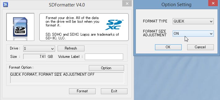 De SD-kaart moet je eerst met een speciale tool formatteren dient eerst met een speciale tool geformatteerd te worden, bijvoorbeeld met SD Formatter 4.0, te downloaden vanaf SDcard.org. Op diezelfde site vind je deze tool ook voor de Mac en Linux. Pak het binnengehaalde bestand uit en installeer de software vanuit Windows. Vervolgens start je SDFormatter (bijvoorbeeld via de inmiddels op het bureaublad verschenen snelkoppeling) en zorg ervoor dat achter Drive de inmiddels in een kaartlezer geprikte SD-kaart is geselecteerd. Vervolgens klik je op de knop Option en selecteer je achter FORMAT SIZE ADJUSTMENT de optie ON. Klik op OK in het venster Option Setting en daarna op Format in het hoofdvenster. Klik op OK ter bevestiging, wacht even en klik dan nogmaals op OK in het geopende informatievenster waarna je SDFormatter kan sluiten.