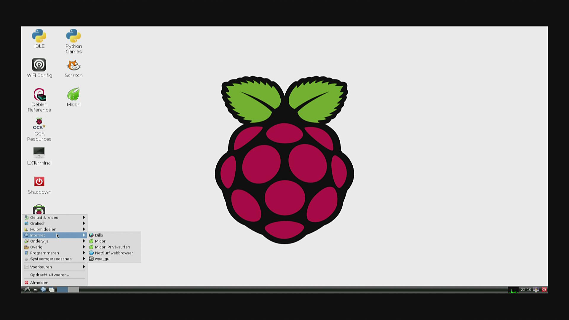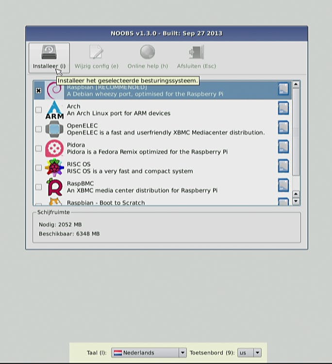Prik nu de SD-kaart in de Raspberry Pi SD-kaartlezer en sluit de voedingsspanning aan. Al snel verschijnt een stukje fruit in beeld en na nog even wachten een installatiemenu. Het is aan te bevelen om Raspbian – een voor de Raspberry Pi geoptimaliseerde Linuxvariant – als besturingssysteem te kiezen. In het taalmenu onder in beeld kies je desgewenst voor Nederlands. Schakel het selectievakje voor Raspbian in en klik op Installeer en daarna op Ja ter bevestiging. Het installeren van het OS kan even duren en is onder meer afhankelijk van de snelheid van de geheugenkaart. Klik na afloop van de installatie op OK, waarna het systeem herstart.