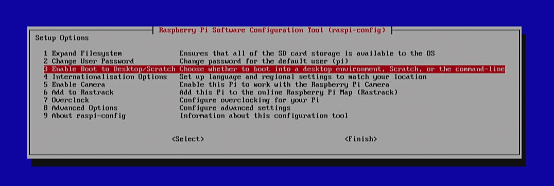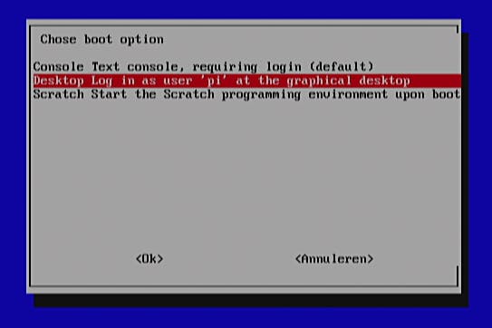 De eerste keer dat Raspbian wordt start, verschijnt een configuratieoptie, selecteer hier met toetsenbord en cursortoetsen de optie 3 Enable Boot to Desktop / Scratch en druk op Enter. Selecteer vervolgens Desktop Log in as user ‘pi’ at the graphical desktop gevolgd door wederom een druk op Enter, waarna Raspberry voortaan in de grafische gebruikersmodus start. Druk nu op de toets Tab tot <Finish> is geselecteerd en druk op Enter en daarna – met Ja geselecteerd – nogmaals op Enter voor een herstart. Je Raspberry Pi is nu klaar voor gebruik!
