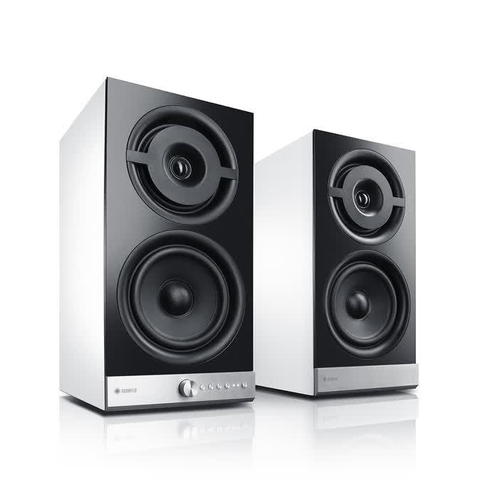 Voor die 900 euro krijg je twee indrukwekkende speakers van 42 x 21 x 27 centimeter, ook het gewicht is niet niks: 10,5 en 11,5 kilo. Het verschil in gewicht zit 'm in het feit dat één van de speakers de netwerkonderdelen heeft ingebouwd. De lichtere speaker wordt met een kabeltje verbonden aan zijn zwaardere metgezel.